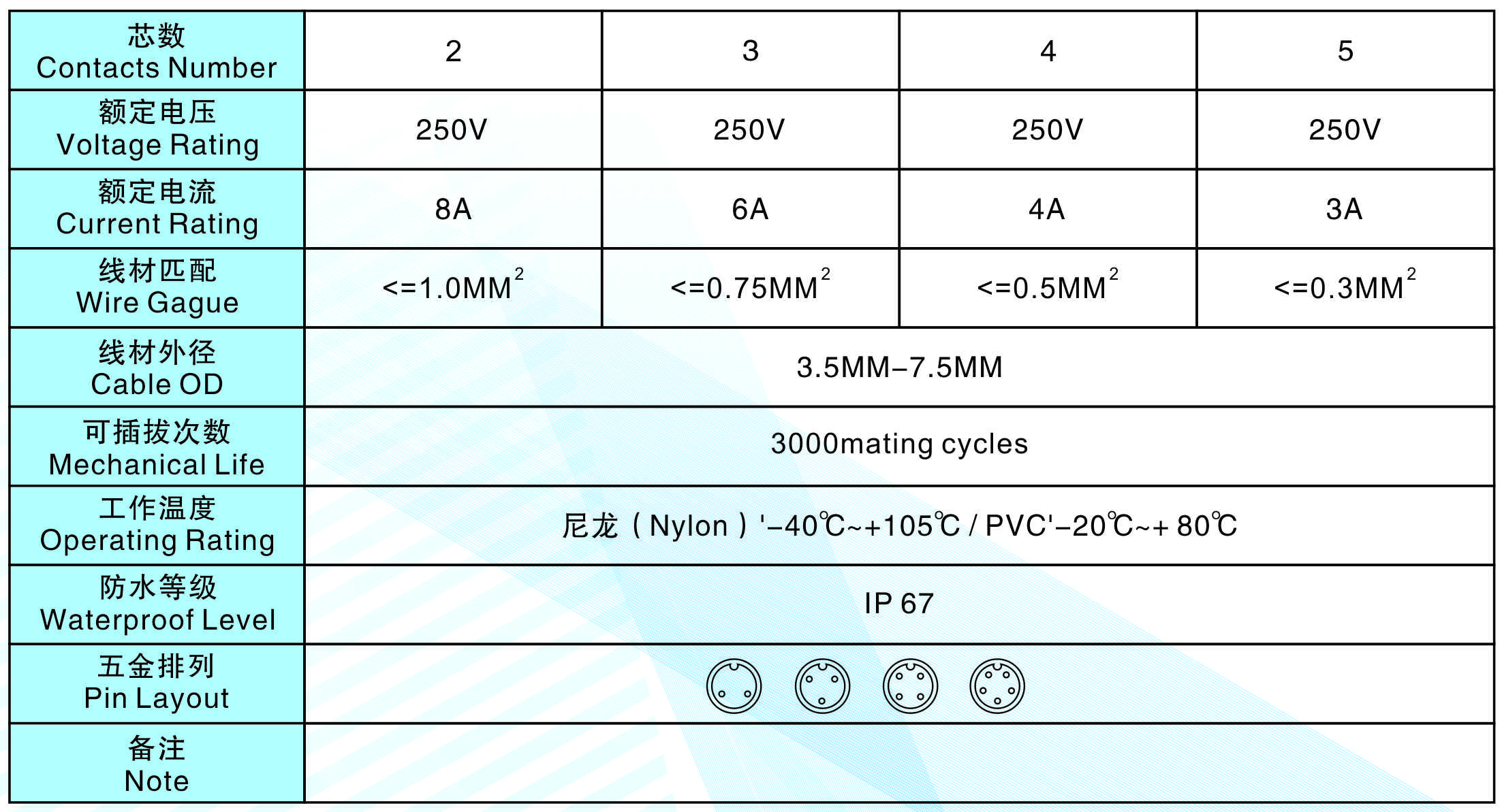 芯數(Contacts  Number):   2 - 5 芯